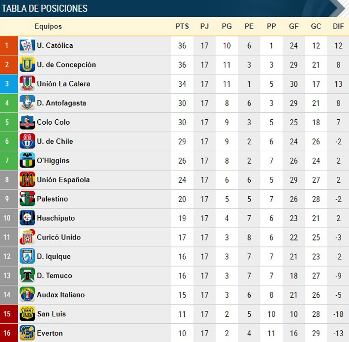 Universidad Católica y Universidad de Concepción están en lo más alto con 36 puntos, seguidos de Unión La Calera que hoy está obligada a ganar para no perderles distancia.