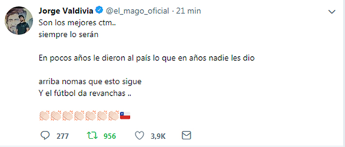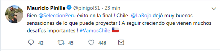 Por su parte, "Pinigol" felicitó a los incaicos y se mostró optimista por lo que viene: "Bien selección Perú éxito en la final ! Chile dejó muy buenas sensaciones de lo que puede proyectar! A seguir creciendo que vienen muchos desafíos importantes! VamosChile".