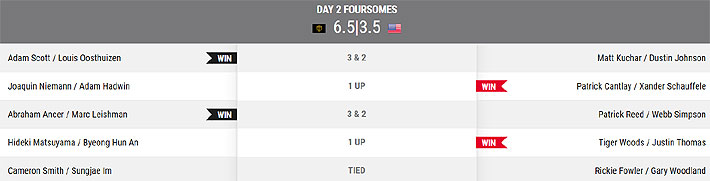 En esta segunda jornada ambos equipos se llevaron 2,5 puntos (un duelo quedó empatado), con lo que el día finalizó con el elenco Internacional ganando en el global con 6,5 puntos contra 3,5 de Estados Unidos.
