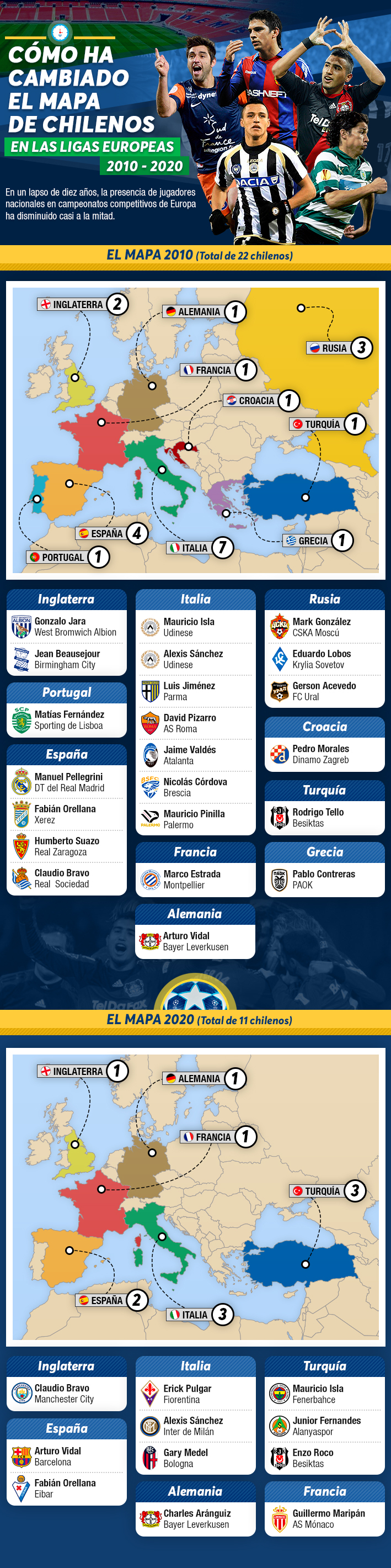 Cómo ha cambiado el mapa de los futbolistas chilenos en Europa en relación a 2010