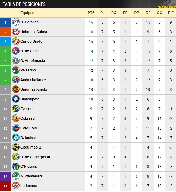 Todos ellos tienen 16 puntos, aunque la UC debe su partido ante la Unión Española. No se pudo debido a la falta de contingente policial.