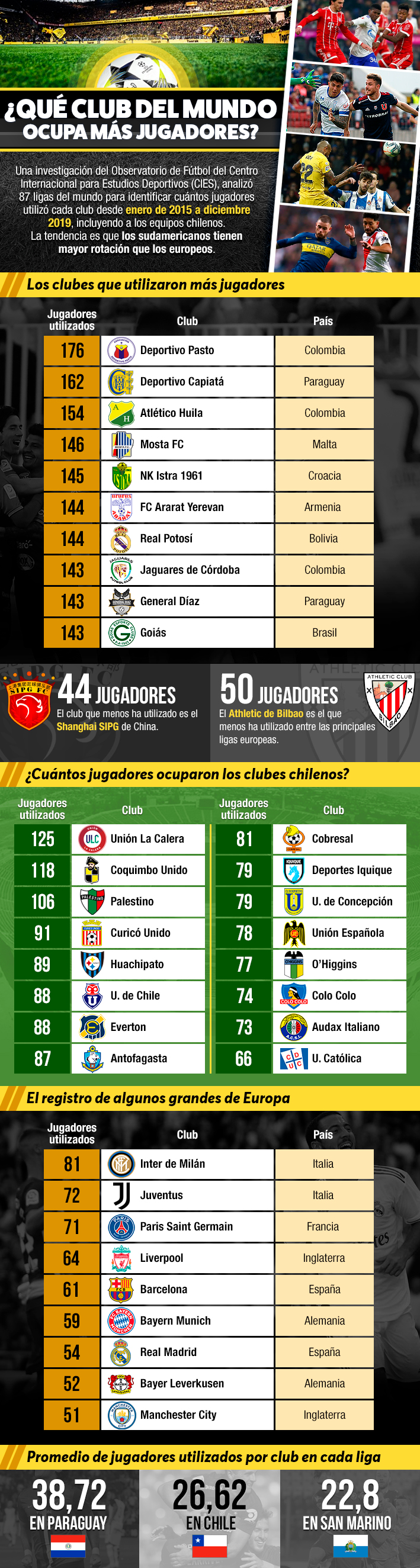 Un análisis del CIES a más de ochenta ligas de todo el mundo, determinó cuáles son las escuadras que más futbolistas utilizaron en los últimos cinco años.