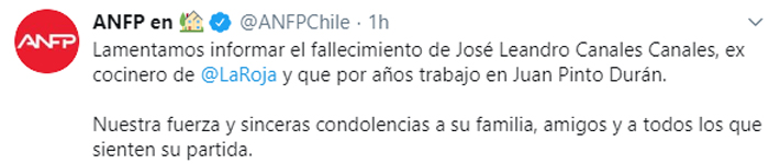 La ANFP también le dedicó un mensaje a Canales a través de Twitter: "Lamentamos informar el fallecimiento de José Leandro Canales Canales, ex cocinero de la Roja y que por años trabajó en Juan Pinto Durán. Nuestra fuerza y sinceras condolencias a su familia, amigos y a todos los que sienten su partida".