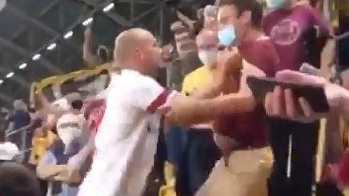 El del Hamburgo subió las escaleras, tomó de la polera y luego tiró al piso al fanático del equipo local. Recibió de vuelta insultos y empujones varios.