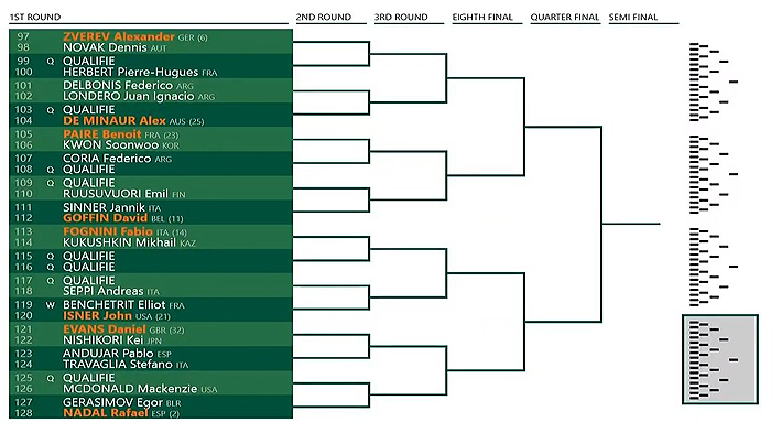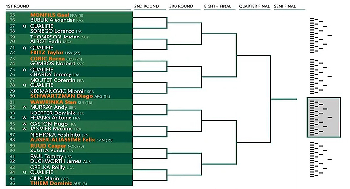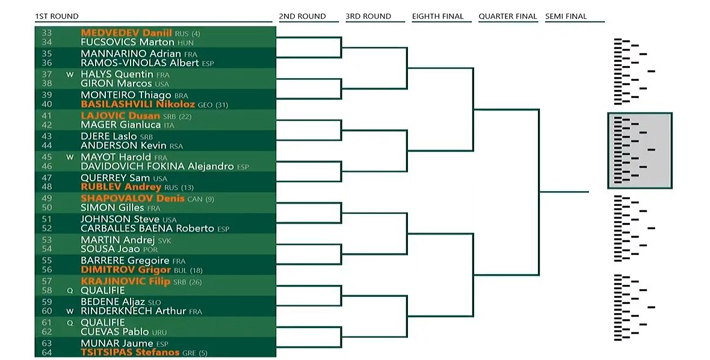 Djokovic hará su debut frente a Mikael Ymer (80°), mientras que Rafael Nadal, favorito al título, chocará con Egor Gerasimov (83°). Dominic Thiem (3°), pupilo de Nicolás Massú, irá contra Marin Cilic (39°).