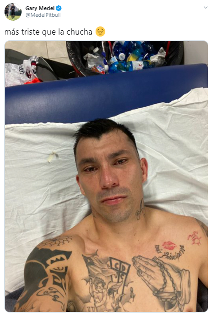 "Más triste que la chu...", publicó el chileno con los ojos llorosos, con un rostro que demostraba suma pena por la lesión. Es posible que sea baja para la selección. Más problemas para Reinaldo Rueda.