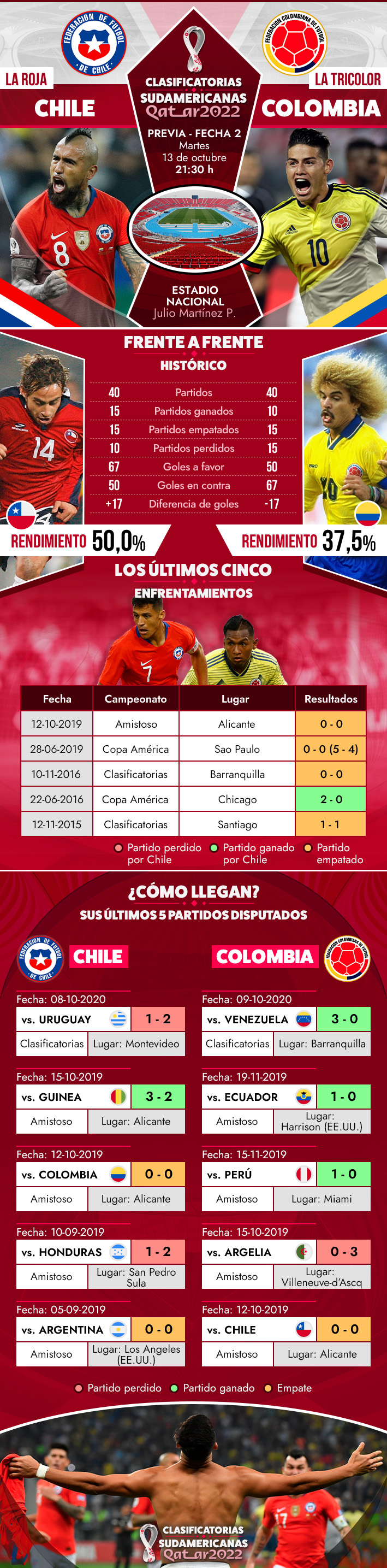 Los últimos enfrentamientos entre ambos, los números históricos y cómo llegan: El cara a cara de Chile y Colombia
