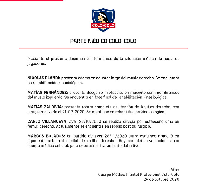 Otros jugadores que están lesionados en Colo Colo son Matías Fernández, Matías Zaldivia que se cortó el tendón de Aquiles, Nicolás Blandi y Carlo Villanueva, a quien se le realizó ayer una "cirugía por osteocondroma en el fémur derecho".