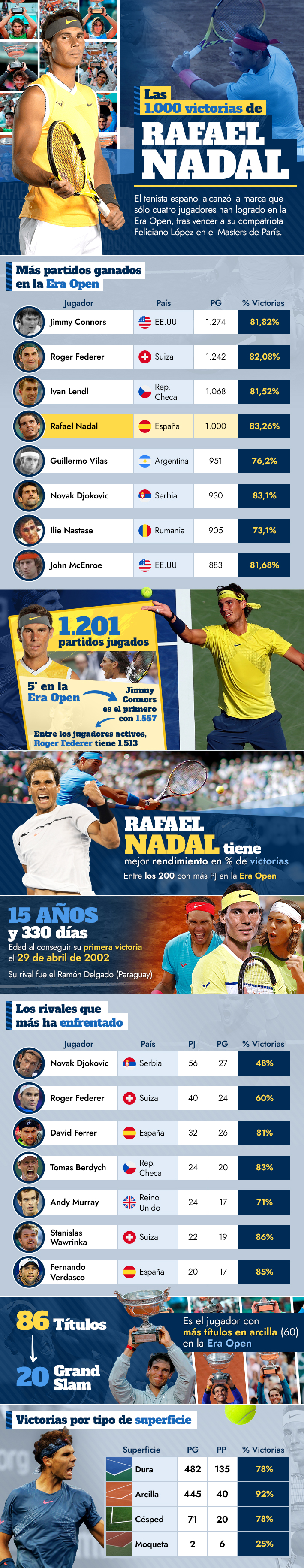 Nadal llega a los 1.000 triunfos en la ATP: Cómo se desglosan sus victorias y qué otros jugadores lo han logrado