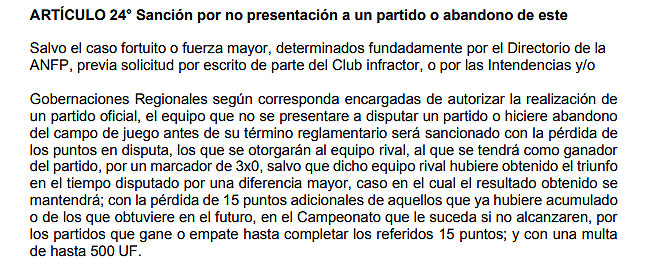 "El equipo que no se presentase a disputar un partido será sancionado con la pérdida de los puntos en disputa, los que se otorgarán al equipo rival, al que se tendrá como ganador del partido, por un marcador de 3x0, y con la pérdida de 15 puntos adicionales de aquellos que ya hubiere acumulado o de los que obtuviere en el futuro", dice el reglamento.