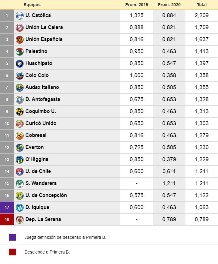 En tanto, en la tabla ponderada 2019-2020, Wanderers y la U peligran con caer a la zona roja. Los azules están muy cerca del puesto que manda a un partido definitorio por el descenso.