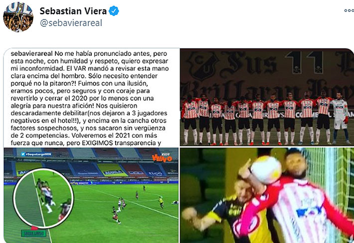 "No me había pronunciado antes, pero esta noche, con humildad y respeto, quiero expresar mi inconformidad. El VAR mandó a revisar esta mano clara encima del hombro (ver más abajo). Solo necesito entender, ¿por qué no la pitaron? Fuimos con una ilusión, éramos pocos, pero seguros y con coraje para revertirlo y cerrar el 2020 por lo menos con una alegría para nuestra afición", comenzó escribiendo.