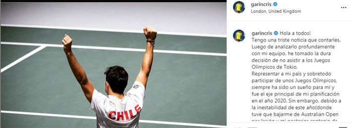Sin embargo, debido a la inestabilidad de este año(donde tuve que bajarme de Australian Open por lesión y mi posterior contagio de Covid 19) y sumado a que las condiciones establecidas, no me permitirán vivir la experiencia real de lo que significan unos Juegos Olímpicos, es por lo que he tomado esta decisión".
