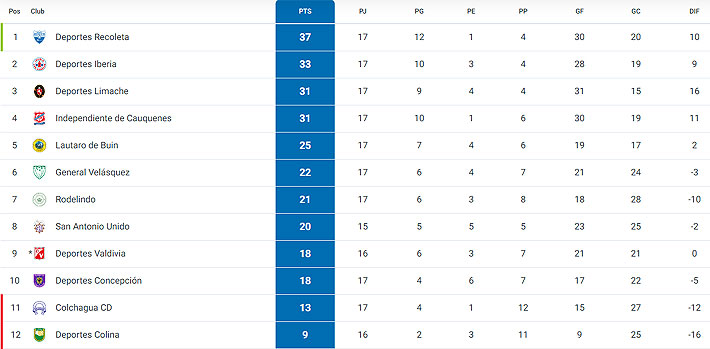 En tanto, en la parte baja, hay dos equipos que lo pasan muy mal: Colchagua, penúltimo con 13 puntos, y Colina, colista con apenas 9 unidades. Muy complicados, considerando que Deportes Concepción, que es el antepenúltimo, está con 18 positivos.