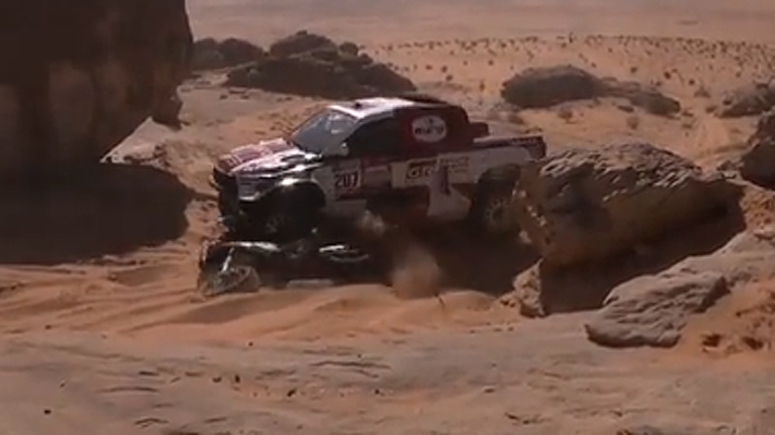 Zumarán, que vuelve a la competencia tras nueve años, estaba detenido en el camino. De atrás llegó Giniel De Villiers, campeón en 2009, y lo atropelló con su camioneta Toyota.