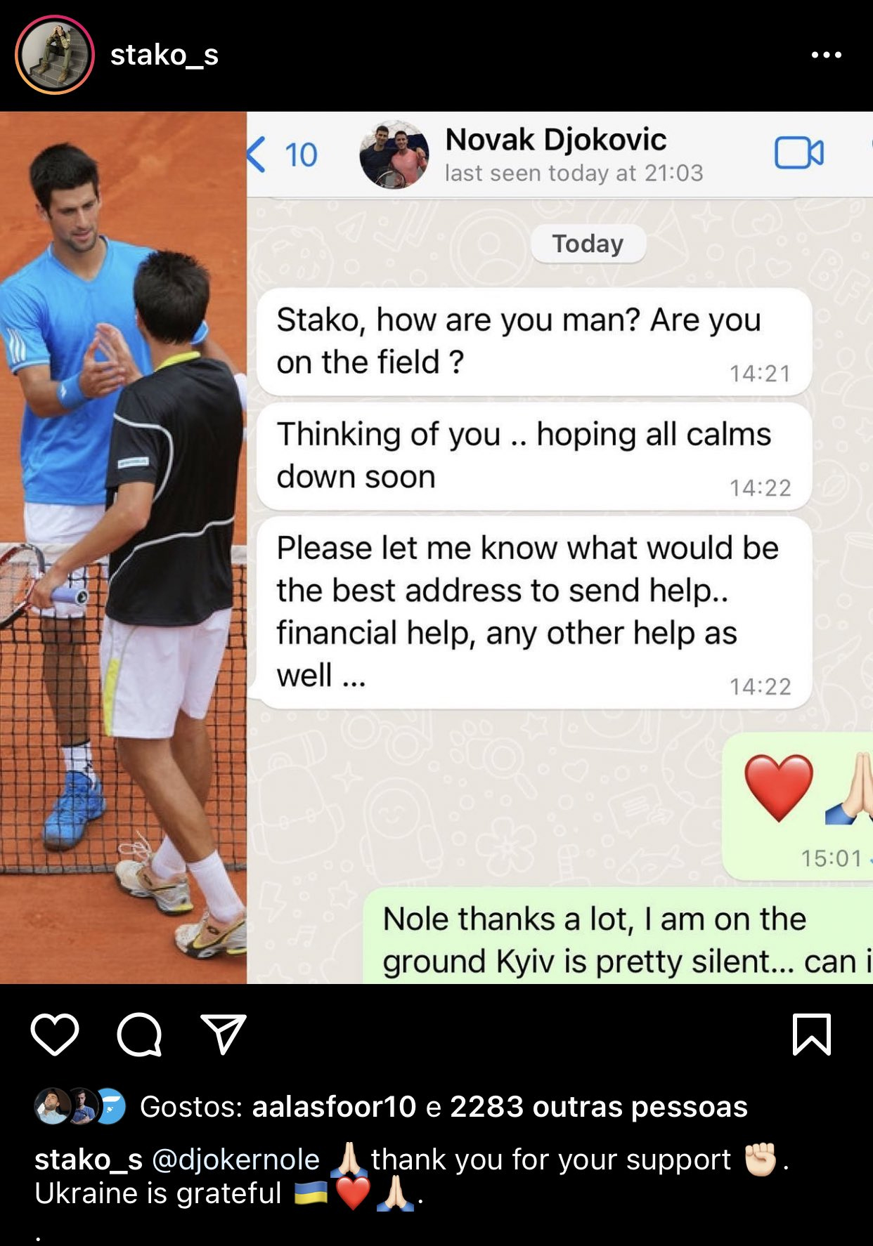 Stako, como estás? Estás en el campo de batalla? Pienso en ti. Espero que todo se calme pronto. Dime a qué dirección puedo enviarte la ayuda... ayuda financiera o cualquier tipo de ayuda...", escribió 'Nole' en una conversación de WhatsApp publicada en Instagram por Stakhovsky.