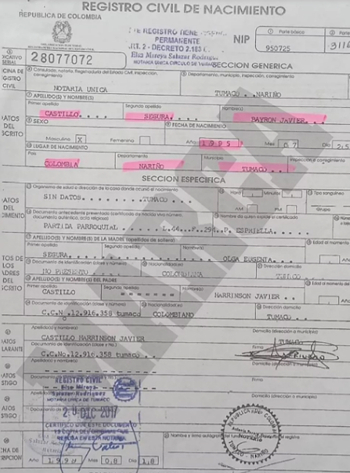 Agregó que "lo que estamos afirmando de una manera categórica es que Byron Javier Castillo Segura nació en Tumaco, Colombia, el 25 de julio de 1995 y Byron David Castillo Segura que hubiera nacido el 10 de noviembre de 1998 no existe, es un fantasma. Es una adulteración, una falsificación e incluso un crimen por las leyes de Ecuador".