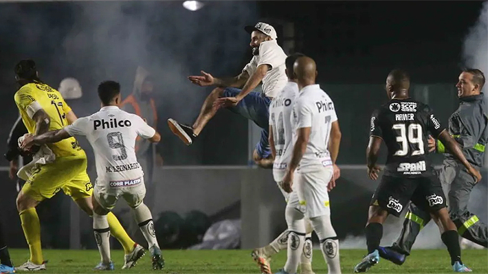 Un hincha del Santos se metió a la cancha y corrió cerca de 30 metros para agredir al arquero del Corinthians, Cassio, que caminaba a la mitad del campo para reunirse con sus compañeros.