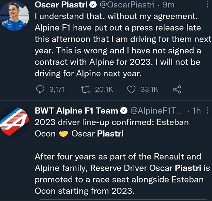Un hecho a lo menos insólito ocurrió este martes en la Fórmula Uno. Resulta que la escudería Alpine anunció que el sustituto del español Fernando Alonso a partir de la próxima temporada sería el australiano Oscar Piastri, pero dos horas después éste lo desmintió con una frase categórica: "No voy a pilotar para Alpine el próximo año".