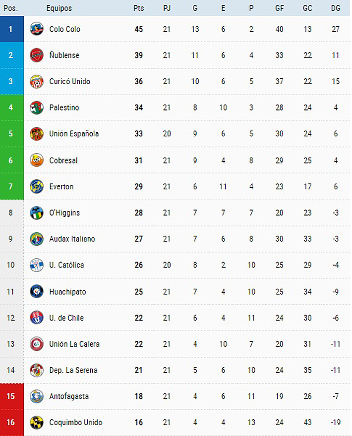 El líder del Torneo, en tanto, es Colo Colo. Los albos tienen 45 puntos, seis más que el segundo Ñublense.