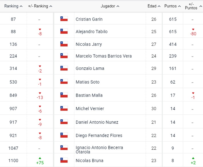 En el escalafón se produjo una inédita situación con dos tenistas chilenos: Cristian Garin (87°) y Alejandro Tabilo (88°).