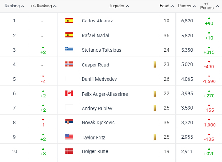 Carlos Alcaraz sigue liderando, seguido por Rafael Nadal.