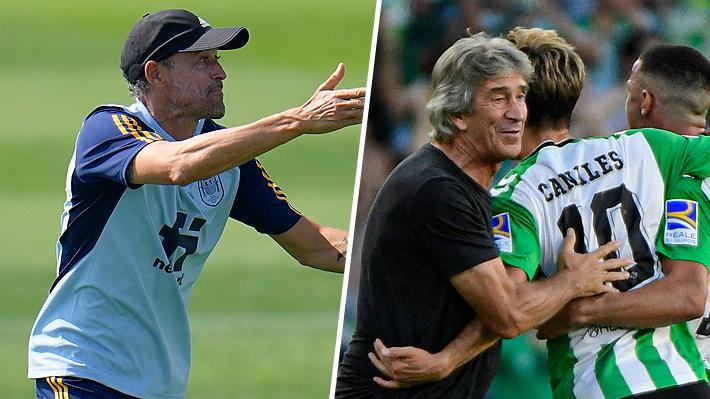 Luis Enrique dirigiendo un entrenamiento de España; Manuel Pellegrini festejando con sus jugadores del Betis.