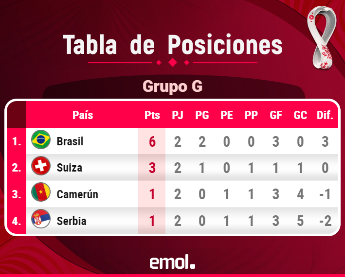 El grupo se definirá desde las 16 horas. Tras Brasil con 6 puntos (+3 goles), las otras tres selecciones restantes tienen opciones de pasar. Suiza tiene 3 unidades (0), Camerún 1 (-1) y Serbia 1 (-2).