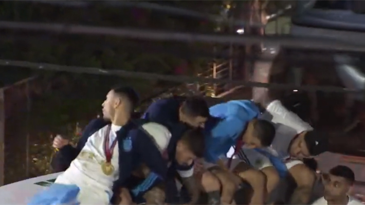 En medio del recorrido, hubo un susto. Rodrigo De Paul, Leandro Paredes, Lionel Messi, Ángel Di María y Nicolás Otamendi celebraban con el trofeo de la Copa del Mundo y no se percataron de unos cables.
