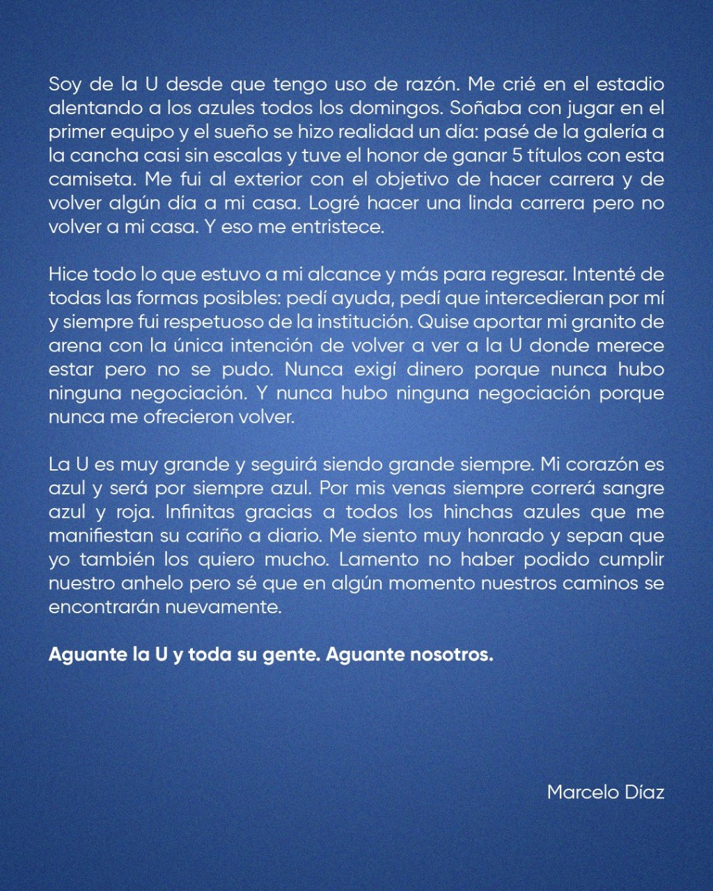 Finalmente, el ex Racing y Libertad sostiene que "la U es muy grande y seguirá siendo grande siempre. Mi corazón es azul y será por siempre azul. Por mis venas siempre correrá sangre azul y roja. Infinitas gracias a todos los hinchas azules que me manifiestan su cariño a diario. Me siento muy honrado y sepan que yo también los quiero mucho. Lamento no haber podido cumplir nuestro anhelo, pero sé que en algún momento nuestros caminos se encontrarán nuevamente".