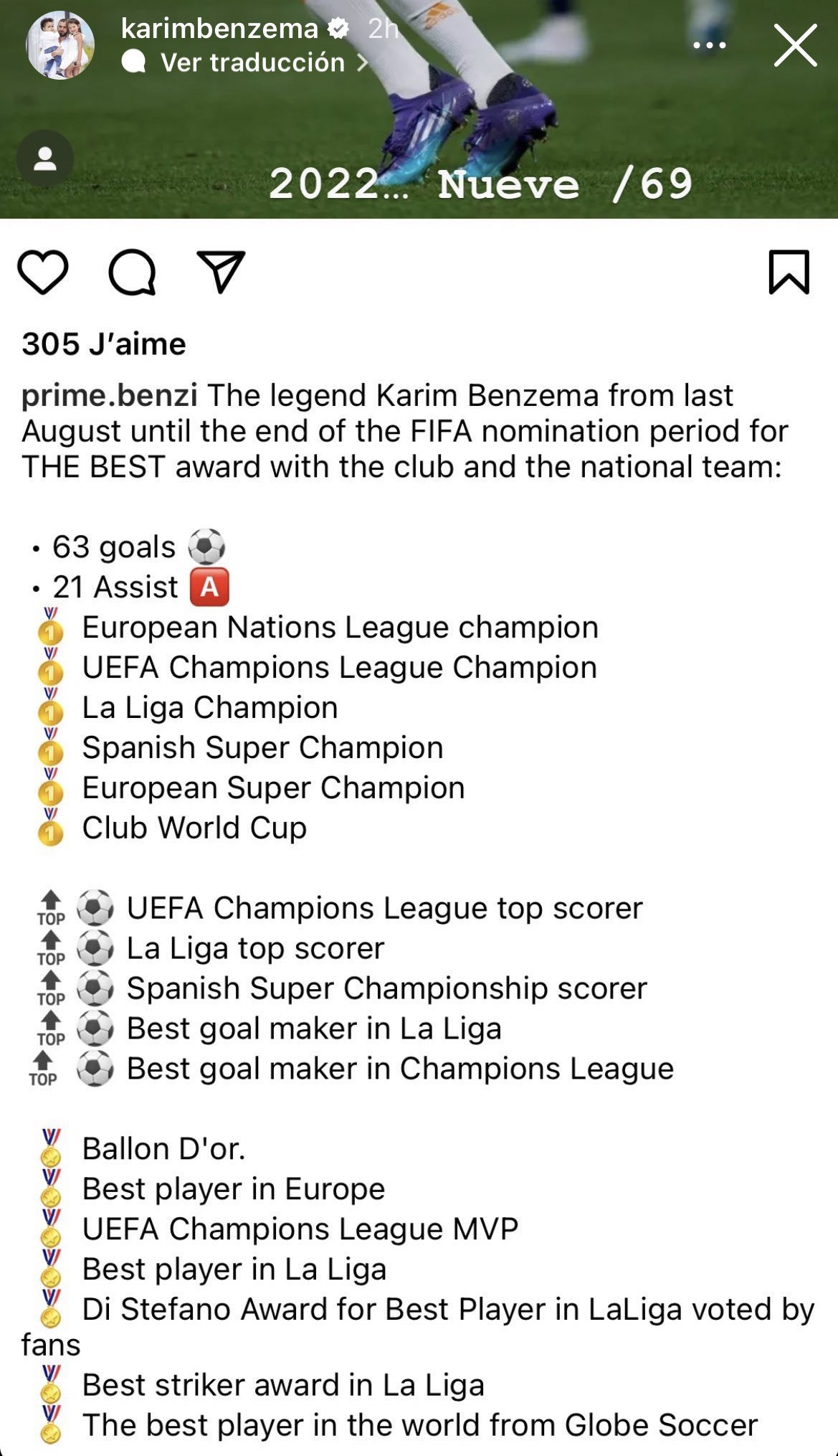 Con varios mensajes en sus historias de esa red social, el goleador del Real Madrid sacó pecho y publicó una imagen con todos sus logros en la última campaña. Entre ellos, sus títulos, sus 63 goles y 21 asistencias en el año calendario.