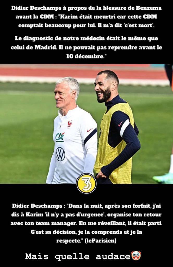 "Karim transmitió los resultados a alguien que le sigue en Madrid, que le dio también su punto de vista. Cuando volvió al hotel, ya era más de medianoche. Fui a la habitación de Karim con nuestro doctor, que había venido para informarme del examen. Él estaba muy triste porque esta Copa del Mundo representaba mucho para él. Me dijo: Está muerto", añadió el seleccionador.