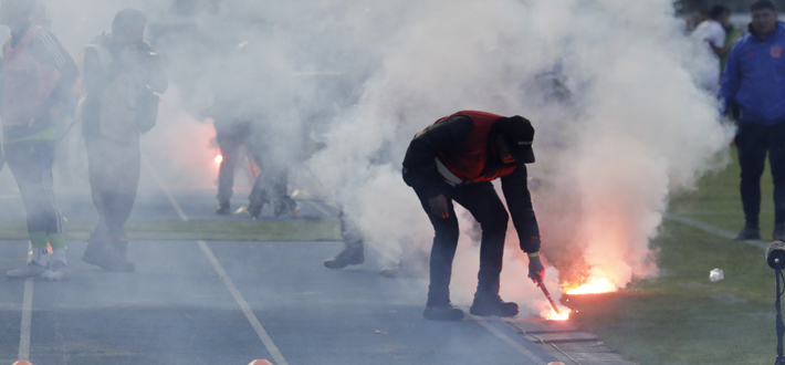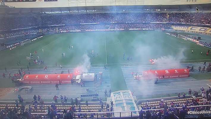 Desde el inicio del partido hubo problemas. Le pidieron a los hinchas que se detuvieran, pero no hicieron caso. Algunos fuegos artificiales cayeron dentro de la cancha, muy cerca del arquero azul Cristóbal Campos.