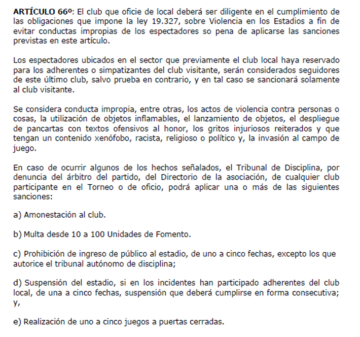 Los castigos puedes ser: 1) Amonestación 2) Multa desde 10 a 100 unidades de Fomento 3) Prohibición de ingreso de público al estadio, de una a cinco fechas, excepto las que autorice el Tribunal de Disciplina 4) Suspensión del estadio 5) Jugar a puertas cerradas.