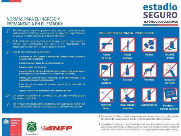 "El Departamento Estadio Seguro perteneciente al Ministerio del Interior y Seguridad Pública, tiene por misión la implementación de la ley 19.327 de derechos y deberes en los espectáculos fútbol profesional. En ese marco busca la coordinación de las tareas del fútbol profesional, a través de la ANFP (Asociación Nacional de Fútbol Profesional); el rol de autorización y reglas de funcionamiento de cada uno de los partidos, a través de las Delegaciones Presidenciales Regionales y Provinciales ; y el rol de Carabineros de Chile, en materia de asesoría de la autoridad política y gestión de la prevención, seguridad y orden público en el fútbol".