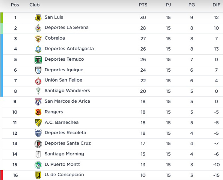 Cabe recordar que la B tiene un solo líder. San Luis está en la cima 30 con puntos.