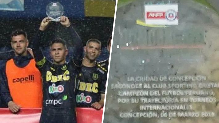 La ciudad de Concepción reconoce al Club Sporting Cristal, campeón del fútbol peruano, por su trayectoria en torneos internacionales. Concepción, 06 de marzo de 2019", decía el galvano entregado al elenco penquista.