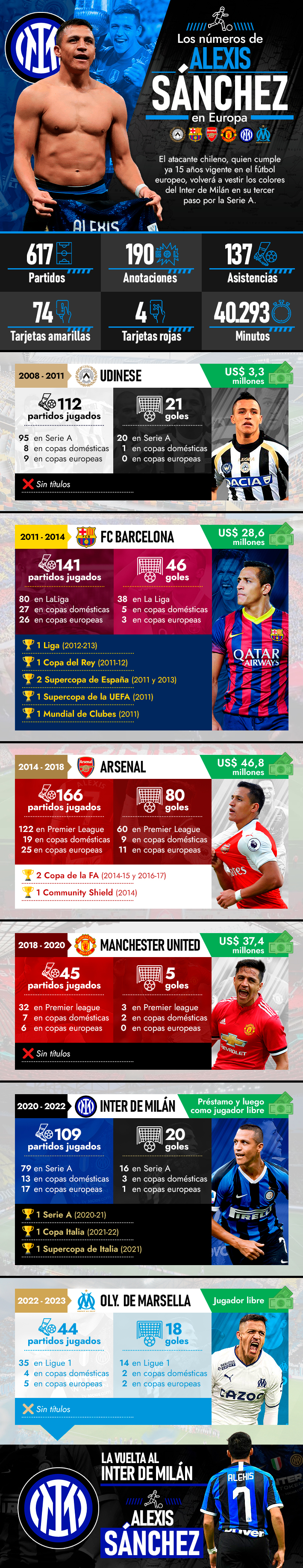 Alexis Sánchez retorna al Inter de Milán: Los números que luce el atacante chileno en sus 15 años en Europa