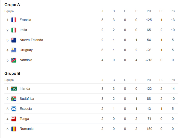 ¿Cómo van todos los grupos? En el A lidera Francia con 13 puntos, en el B es Irlanda con 14, en el C Gales con 14 y en el D Inglaterra con 14.