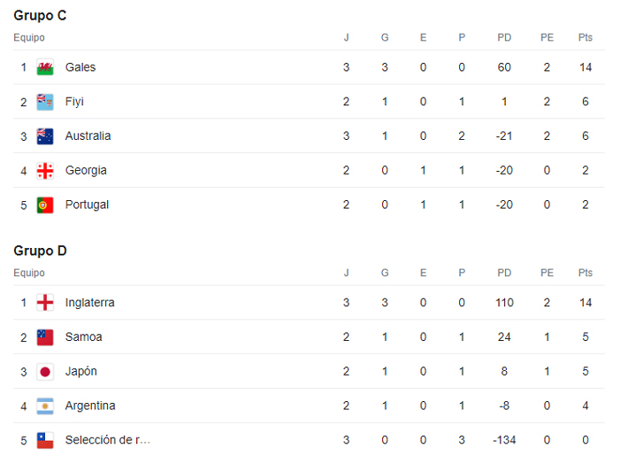 De momento, Gales es el único confirmado en cuartos de final, pero muy cerca están de sellar su avance Francia, Inglaterra e Irlanda. Australia, en tanto, es una de las sorpresas: Quedó virtualmente eliminado tras perder 40-6 con Gales el último fin de semana. Un fracaso estrepitoso.