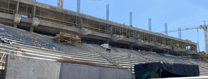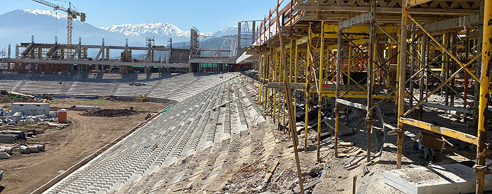 La vuelta sigue por la Tribuna Fouillioux. También avanza a paso firme. Espera por la instalación de las galerías, las que "llegarán listas para ser ensambladas en esos pilares con forma de escaleras que se aprecian", especifican.