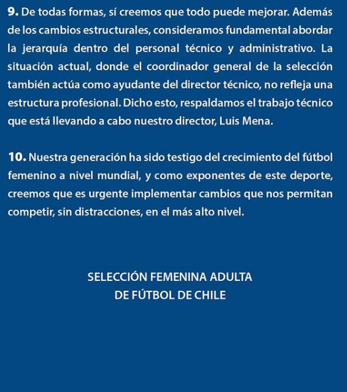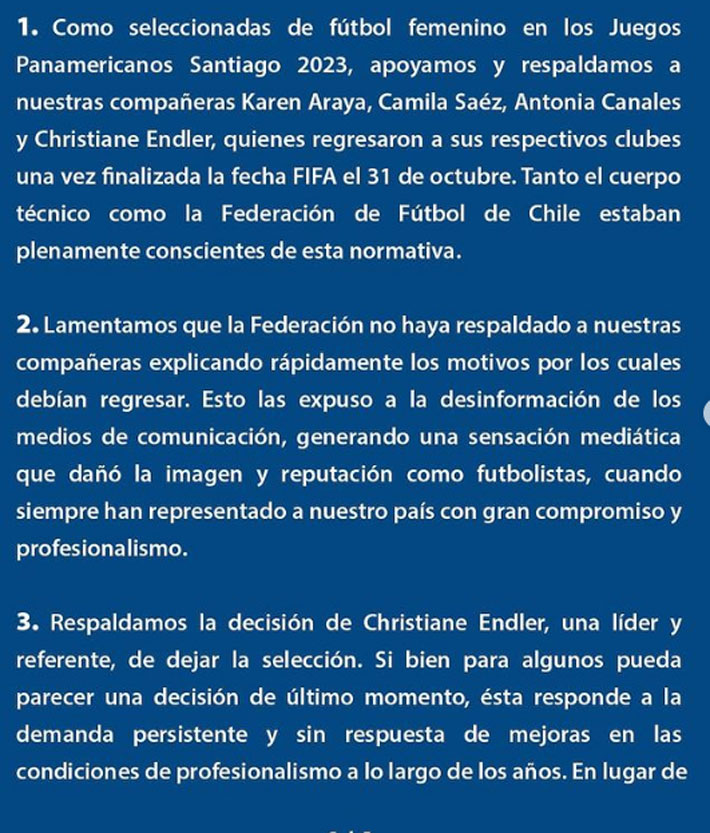"Respaldamos la decisión de Endler, una líder y referente, de dejar la selección. Si bien para algunos pueda parecer una decisión de último momento, ésta responde a la demanda persistente y sin respuesta de mejoras en las condiciones de profesionalismo a lo largo de los años", dice el comunicado.