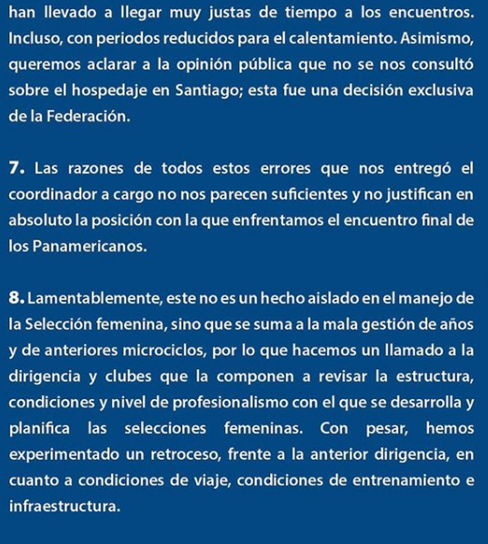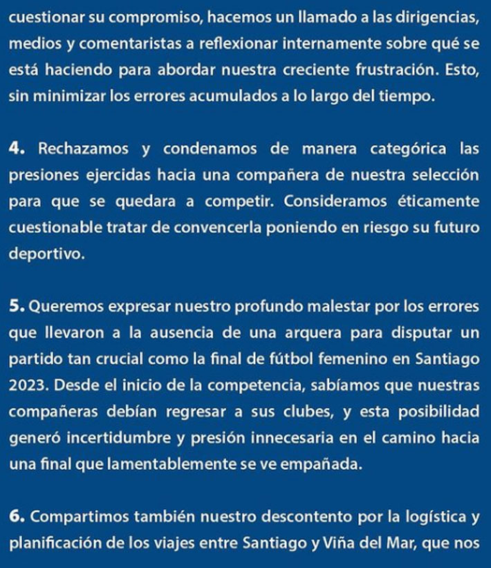 En otros puntos, cuestionan la logística hecha para los Panamericanos apuntando a los traslados entre Santiago y Viña del Mar. Hablan de una "mala gestión de años" y de un "retroceso frente a la anterior dirigencia".