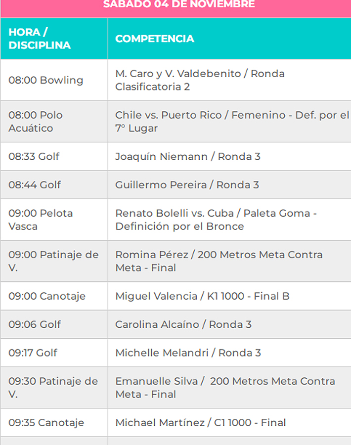 Penúltimo día de competencias en los Juegos Panamericanos Santiago 2023 y la agenda estará muy recargada con actividad durante todo el día y en muchos deportes.