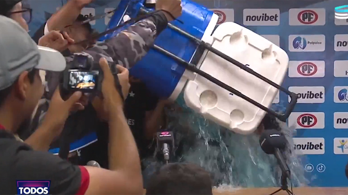 Mientras el técnico argentino daba sus impresiones del título, fue sorprendido por jugadores del plantel que lo bañaron con agua, en un momento más de la celebración acerera.