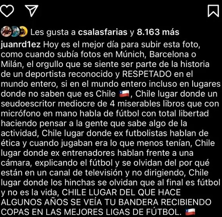 Luego agregó. "Chile, lugar donde un pseudo escritor mediocre de 4 miserables libros, que con micrófono en mano habla de fútbol con total libertad haciendo pensar a la gente que sabe algo de la actividad. Chile lugar donde ex futbolistas hablan de ética y cuando jugaban era lo que menos tenían. Chile lugar donde ex entrenadores hablan frente a una cámara, explicando el fútbol y se olvidan del porqué están en un canal de televisión y no dirigiendo".
