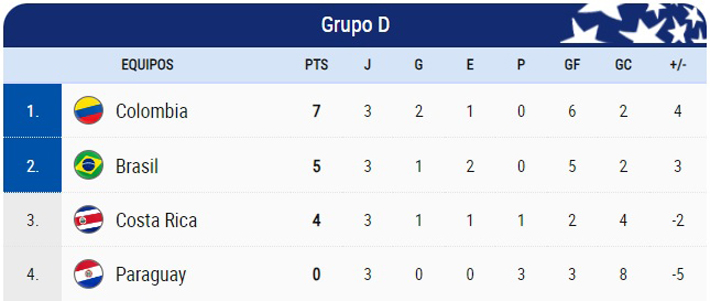 Este martes se cerró el Grupo D. Colombia empató a uno con Brasil y Costa Rica derrotó 2-1 a Paraguay. Con esos resultados, el elenco cafetalero avanzó primero y se medirá en la siguiente fase con Panamá. La "canarinha", en tanto, fue segunda e irá contra los charrúas, que fueron líderes del Grupo C con campaña perfecta.
