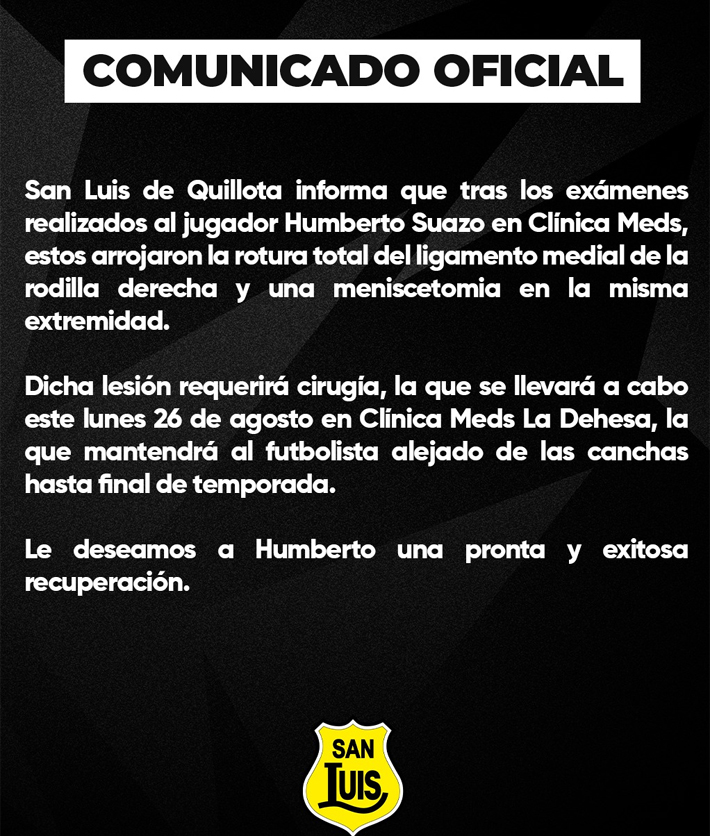 Tras los exámenes realizados al jugador Humberto Suazo en Clínica Meds, estos arrojaron la rotura total del ligamento medial de la rodilla derecha y una meniscetomia en la misma extremidad. Dicha lesión requerirá cirugía, la que se llevará a cabo este lunes 26 de agosto en Clínica Meds La Dehesa, la que mantendrá al futbolista alejado de las canchas hasta final de temporada".