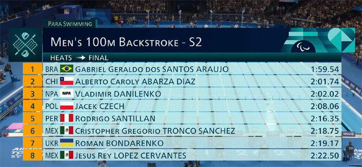 En los 100 metros espalda categoría S2 de la natación, el nacional quedó segundo en su heat clasificatorio y