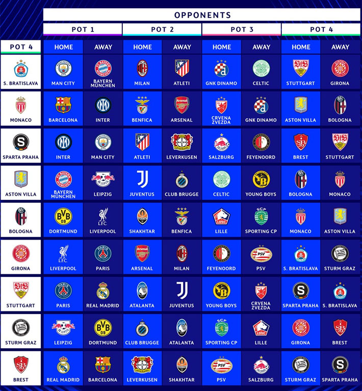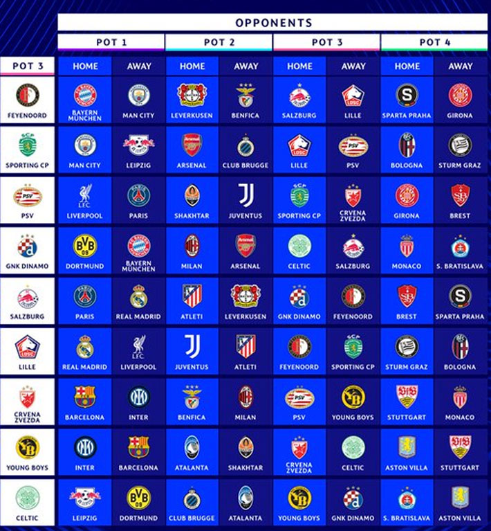Con el nuevo formato, los equipos jugarán ocho partidos en la nueva fase liga. Ya no jugarán dos veces contra tres rivales (en casa y fuera), sino que se enfrentarán a ocho equipos diferentes, jugando la mitad de ellos en casa y la otra mitad fuera.
